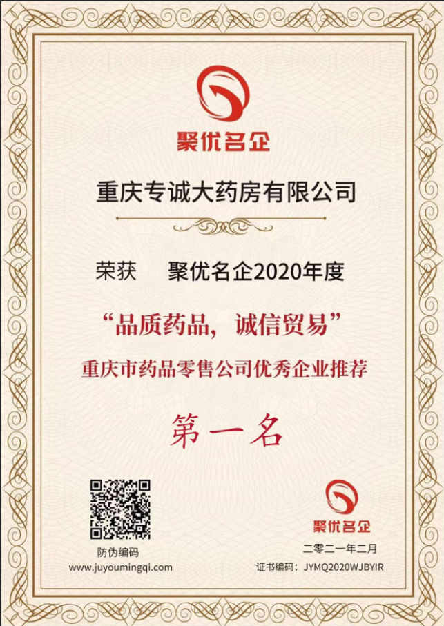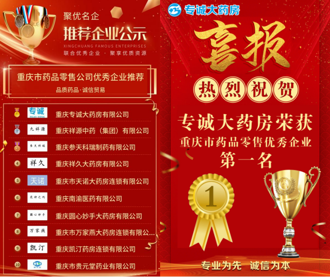 2月2日,为期两个月的重庆市药品零售优秀企业评选落下帷幕,在经过网络投票、专家甄选等环节,专诚大药房以第一名的优异成绩当选重庆市药品零售优秀企业。
