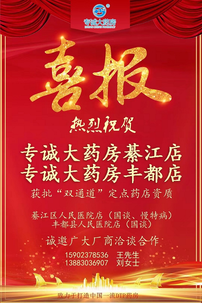 日前,重庆市医保保障局公布专诚大药房綦江店、丰都店获批“双通道”医保定点药店资质,其中綦江店批准的是国谈、慢特病报销资格,丰都店批准的是国谈报销资格,丰都店也是丰都县唯一一家“双通道”医保定点药店。綦江店和丰都店同步获得“双通道”定点资质,代表着专诚DTP药房的专业水平和管理水平得到了监管部门的认可。