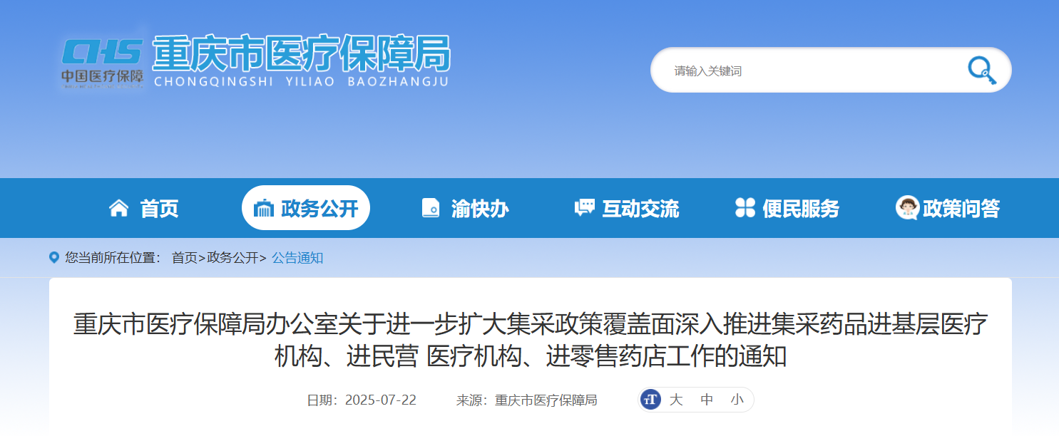 根据国家医保局关于进一步扩大集采政策覆盖面,促进集采药品进基层医疗机构、进民营医疗机构、进零售药店的要求,按照重庆市医疗保障局办公室《关于印发〈重庆市集采药品“进村卫生室、进民营医疗机构、进零售药店”工作方案〉的通知》(渝医保办〔2024〕71号)安排,决定进一步扩大集采政策覆盖面,规范有序推进集采药品广泛进入基层医疗机构、民营医疗机构、零售药店(以下简称“三进”),现将有关事项通知如下。